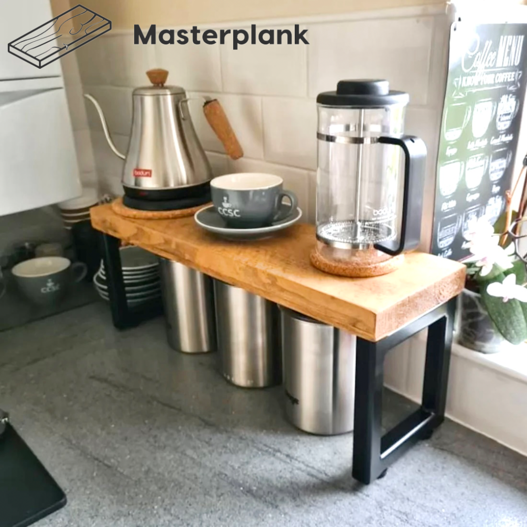 Bespoke rustic shelf, with box section legs in a variety of colours. fabricated from recycled scaffold boards. Perfect for holding spices, using as a coffee shelf or a monitor shelf.